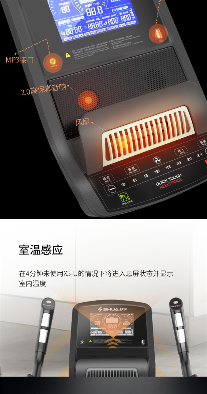 舒华商用跑步机SH-T8919采用t2.2mm黑钻纹(可选配:t2.4免维护跑带)的跑带,,选用手握心率测试 自带心率带及增加心率控速(HRC)程序模块、接触式心率感应测量心跳等数据,跑步面积达580×1570mm,可承受180kg的使用者使用。